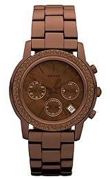 Dress watch, Japanese quartz movement, Chronograph featuring 24-hour, 30-minute and chronograph seconds subdials, Polished brown hands and sweep seconds, Polished brown hands mark subdials, Applied polished brown baton markers, White Arabic numbers and indices mark subdials, Analog date aperture between four and five o’clock, Brown mother-of-pearl dial with polished brown logo applique below twelve o’clock, Polished brown-ion-plated stainless steel bracelet with adjustable links and push-button-clasp, Polished brown-ion-plated stainless steel bezel encrusted with brown crystals, Textured brown-ion-plated steel crown, Polished brown-ion-plated steel selector buttons, Stainless steel caseback, Mineral crystal, 5ATM (50 meters/165 feet water resistant)Price: $ Read More and Buy it here!