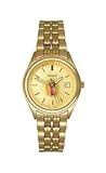 Quartz movement, Dress watch, Gold-tone luminous hands, Gold-tone hour markers, Black small indices, Religious icon print on center dial, Analog date display, Polished stainless steel gold-tone bezel, case with brushed accents and crown, Polished stainless steel silver-tone caseback, Water resistant